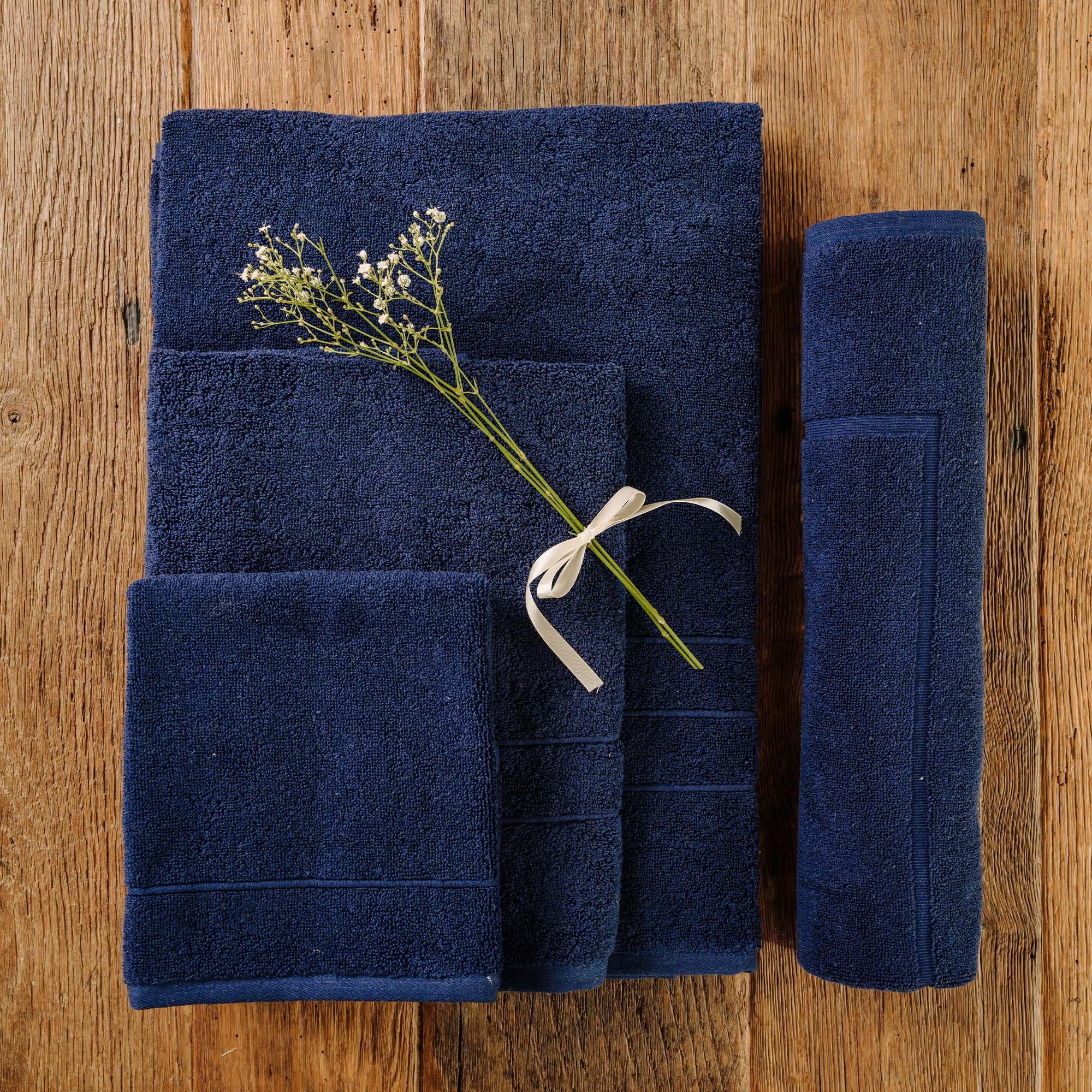 - Include: 1 asciugamano viso (60x100 cm) + 1 asciugamano mani (40x60 cm) + 1 telo doccia (100x150 cm) + tappetino (60x100 cm)